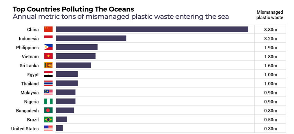- China ranks #1 globally for mismanaged plastic waste and total plastic pollution entering the oceans (Jambeck et al., Science 2015; updated estimates in Our World in Data 2024).