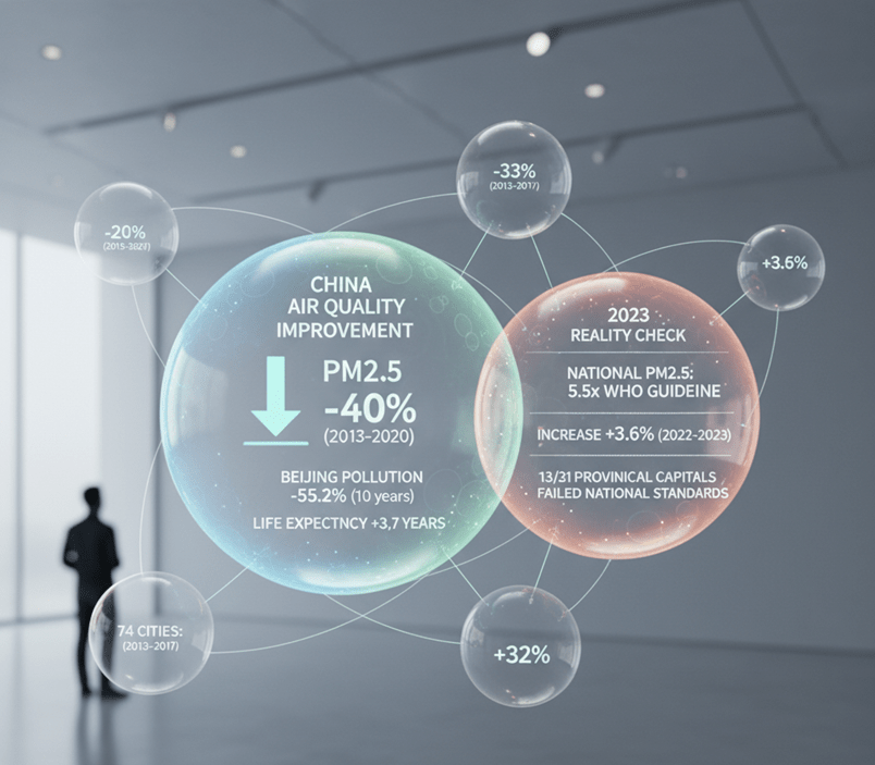 - Beijing exemplifies the shift: PM2.5 dropped from 89.5 μg/m³ (2013) to ~33 μg/m³ (2024), adding an estimated 3–4 years to average life expectancy (University of Chicago AQLI).