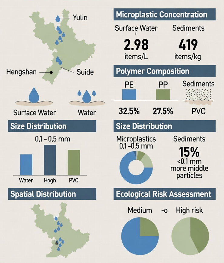 - Dominant polymers: PE (32.5%) and PP (27.5%) in water; more high-density fragments (e.g., PVC) trapped in sediments