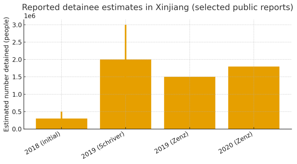- Reported detainee estimates: public reporting contains wide ranges. This is partly because reporting aggregated different kinds of detentions (temporary administrative re-education; longer incarceration; penal sentences) and because independent verification inside Xinjiang remains extremely limited. The estimates remain important because multiple independent sources, leaked documents, survivor testimony and government budgetary lines converge on a picture of large-scale, state-organised programs of detention and transformation.