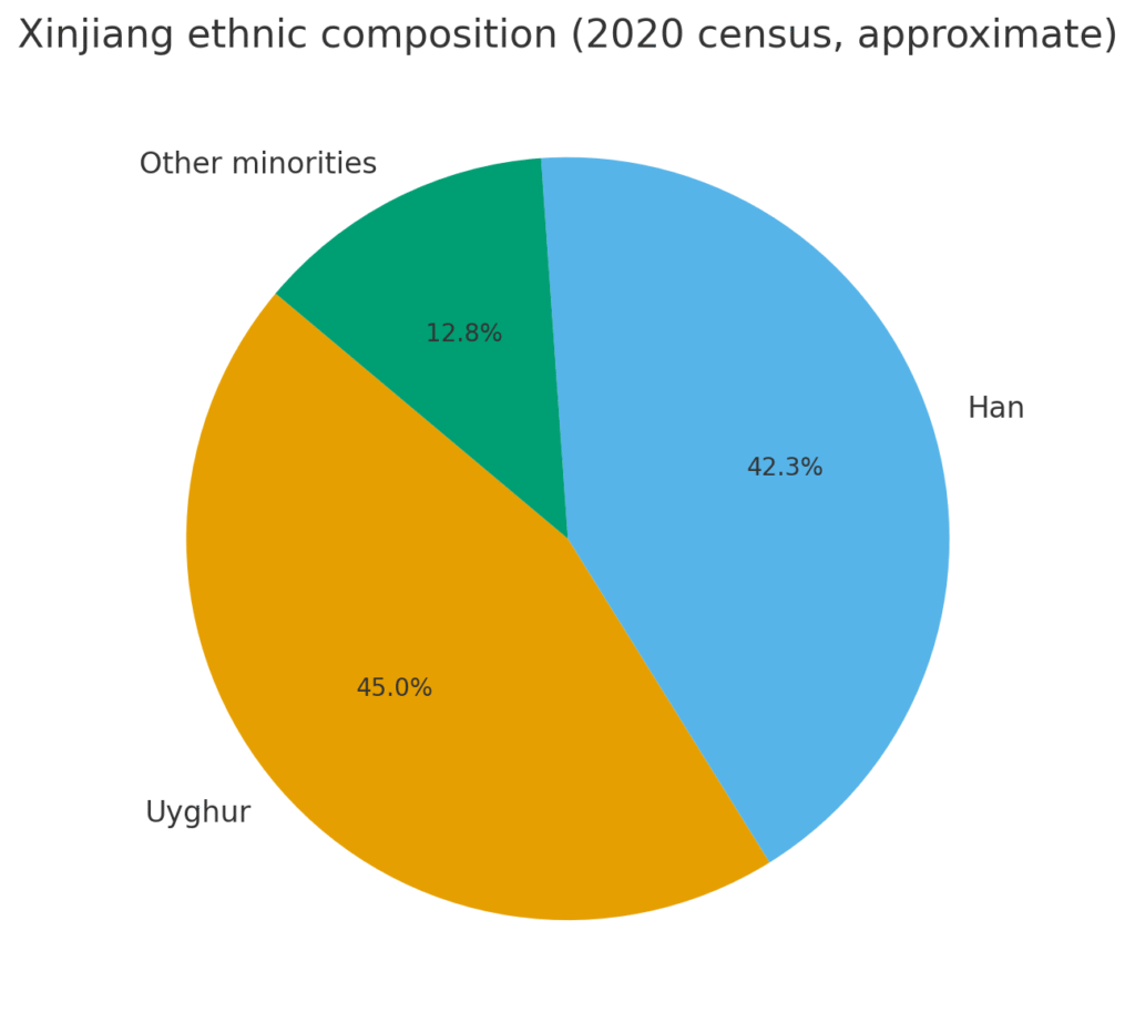 - Ethnic composition (2020 census): Uyghurs remain the largest single ethnic group in the region according to the official 2020 census (≈45%), with Han close behind (≈42%), and other minorities making up the rest. Demographic change is itself a contested field: some analyses point to migration, language change and policy-driven education and family-planning measures as forces changing the region’s social fabric. These are matters of both policy and human consequence.