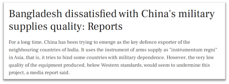 Across multiple recipient states, recurring reliability issues were observed in systems such as Pakistan’s JF-17 and F-7 fighter aircraft, Bangladesh’s F-7BGI fleet and MBT-2000 tanks, and Pakistan Navy’s F-22P frigates, where early technical faults and system malfunctions reduced operational performance.