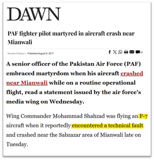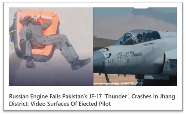 - Example: On June 5, 2024, a JF-17 Block 2 crashed near Jhang due to engine failure.
