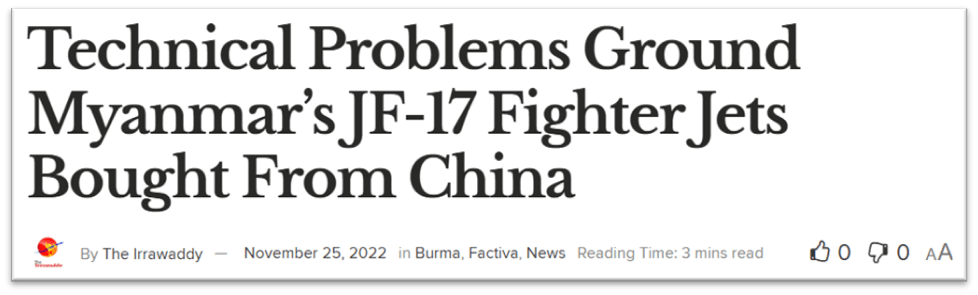The first alarm bell for the JF-17’s export ambitions sounded in Myanmar, and it did so publicly, not quietly. The Irrawaddy’s headline “Technical Problems Ground Myanmar’s JF-17 Fighter Jets Bought From China” captured the scale of the crisis: an entire fleet rendered non-operational within years of induction due to structural cracking, avionics instability, and stubborn engine defects. Instead of routine upgrade cycles, Myanmar found itself in emergency troubleshooting mode.