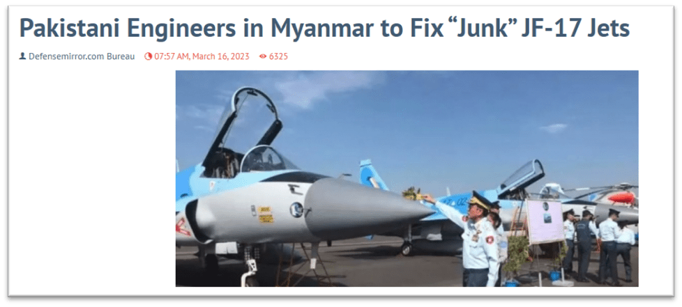 Matters worsened when Defence Mirror published the blunt assessment “Pakistani Engineers in Myanmar to Fix ‘Junk’ JF-17 Jets”, reporting that teams dispatched from Pakistan were attempting not standard maintenance, but fundamental remediation, incompatible with how a frontline fighter should function. Such coverage not only documented technical failings; it signalled to the global market that the aircraft required caretaker support unavailable to most small air forces.